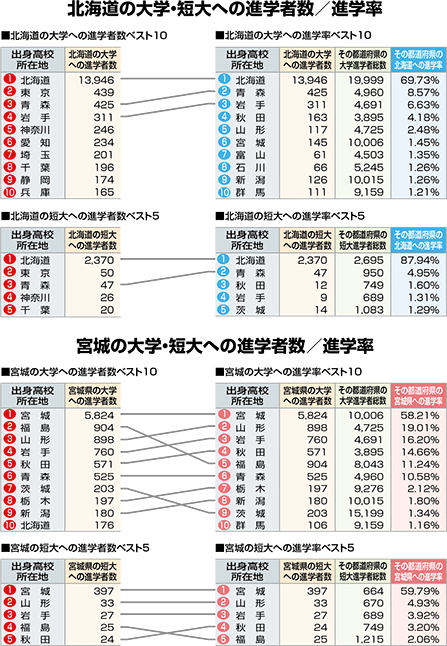 | 北海道、宮城への進学者数と「大学・短大進学者のうち何%が北海道、宮城に進学したか」という進学率の2つの視点から都道府県別にまとめました。 |