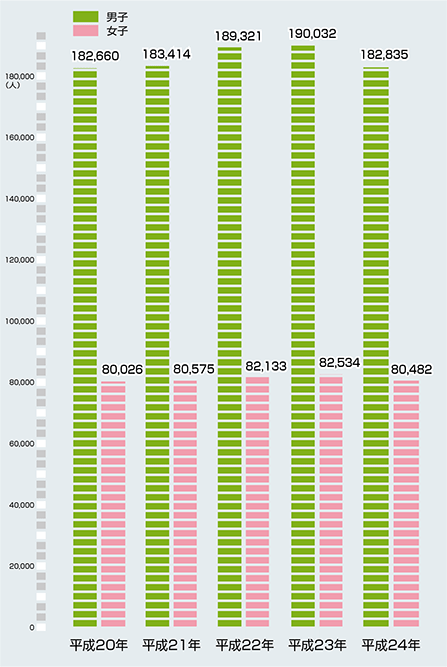 | データ資料: | 各年の学校基本調査報告書 平成24年は学校基本調査速報(平成24年8月発行)より<文部科学省> |