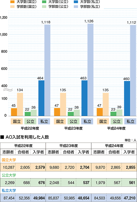 | AO入試を実施した国公私立の大学・学部数(平成22~24年度) |