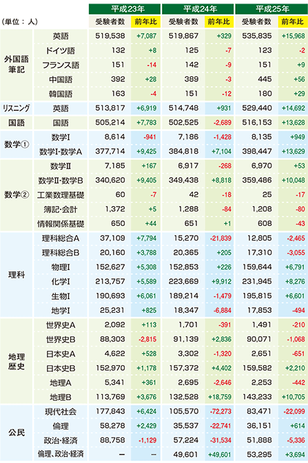 | データ資料: | 「平成25年度大学入試センター試験実施結果の概要」より <独立行政法人大学入試センター> |