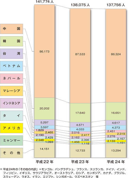 | データ資料: | 「平成24年度外国人留学生在籍状況調査結果」独立行政法人日本学生支援機構 |
