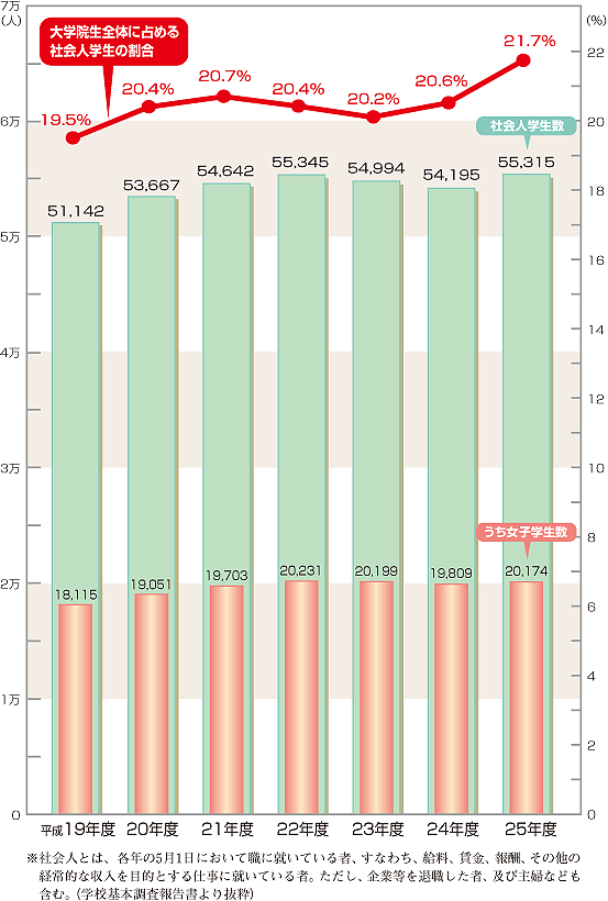 | 平成25年度は社会人学生数55,315人と昨年よりも若干増加しました。また、大学院学生数に占める割合も21.7%と向上しました。 |