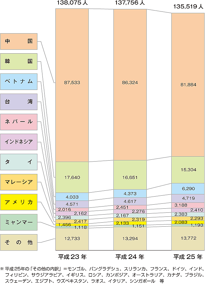 | データ資料: | 「平成25年度外国人留学生在籍状況調査結果」独立行政法人日本学生支援機構 |