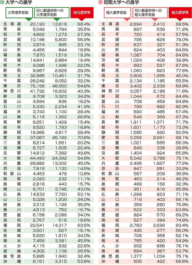 | 2014年に大学・短期大学へ進学した者(浪人含む)のうち、出身高校と同じ都道府県の大学・短期大学へ進学した割合です。 |