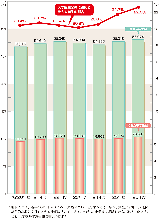 | 大学院生全体に占める社会人学生の割合と学生数 |
