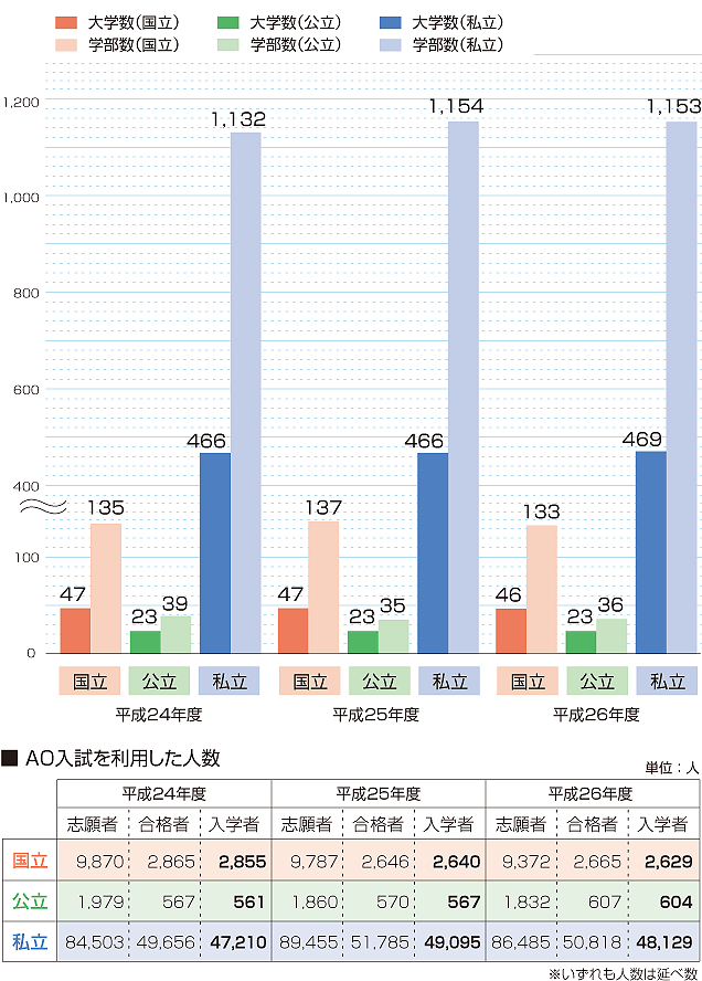 | AO入試を実施した国公私立の大学・学部数(平成24~26年度) |