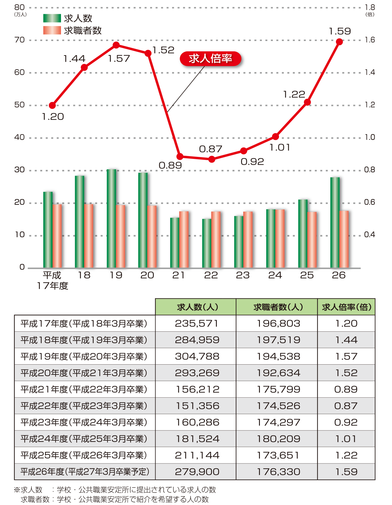 | データ資料: | 平成26年度高校・中学新卒者の求人・求職・内定状況(平成26年9月末現在)について <厚生労働省> |