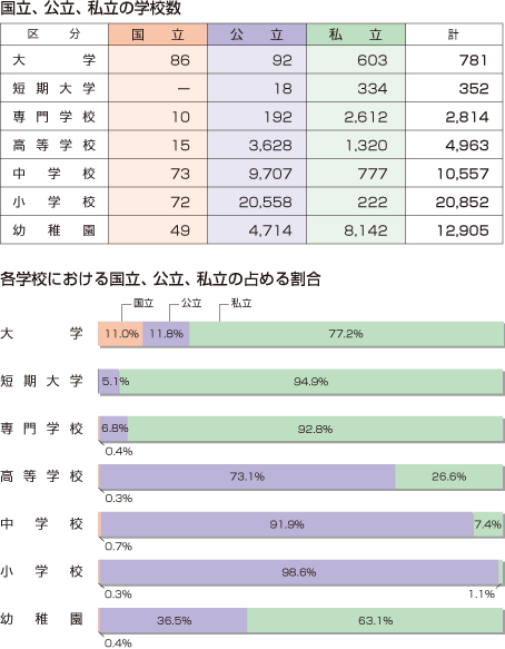 | 私立の学校の占める割合は、幼稚園で63.1%、小学校で1.1%、中学校で7.4%、高等 学校で26.6%となっています。 |