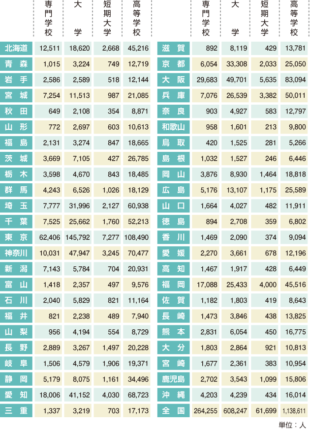 | データ資料: | 平成26年度学校基本調査報告書(平成26年12月発行)より ※高等学校の数値は、平成26年5月時点で1年に在籍する学生数(全日制+定時制) <文部科学省生涯学習政策局政策課調査統計企画室発行> |