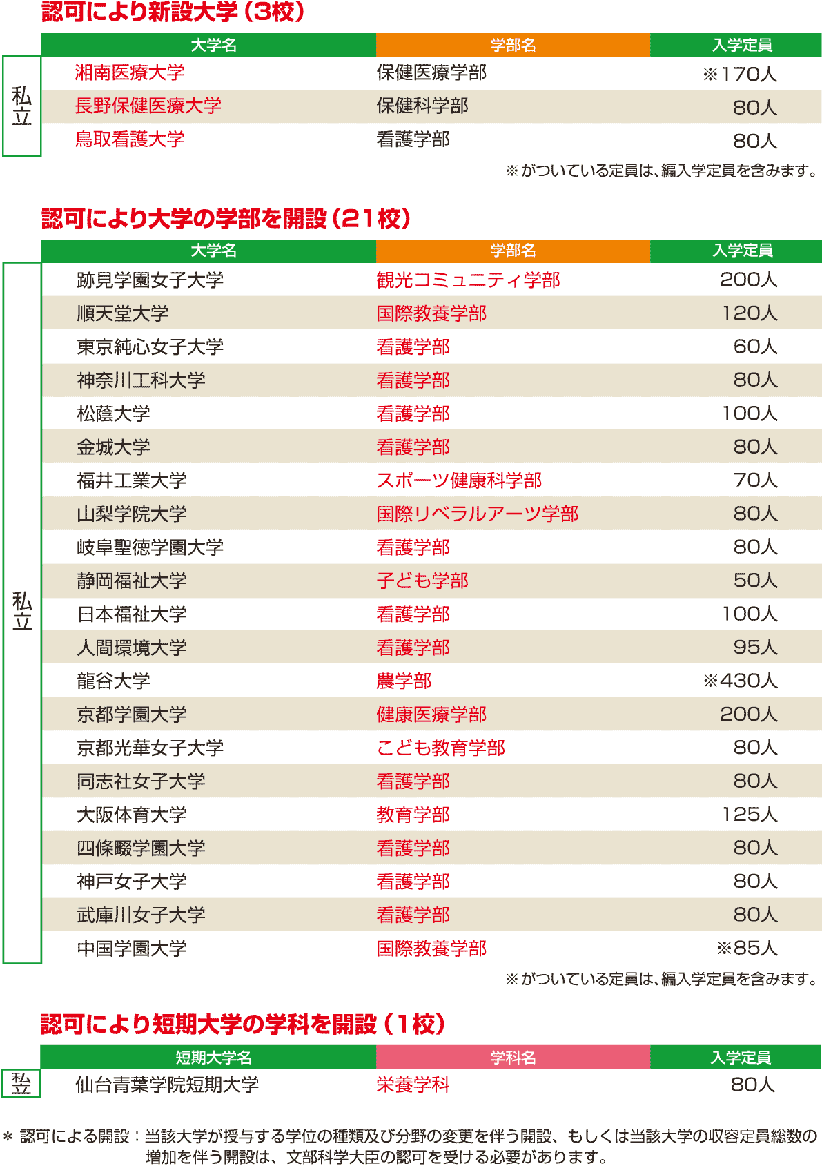 | データ資料: | 平成27年度開設予定大学一覧、 平成27年度開設予定学部等認可申請一覧<文部科学省> |