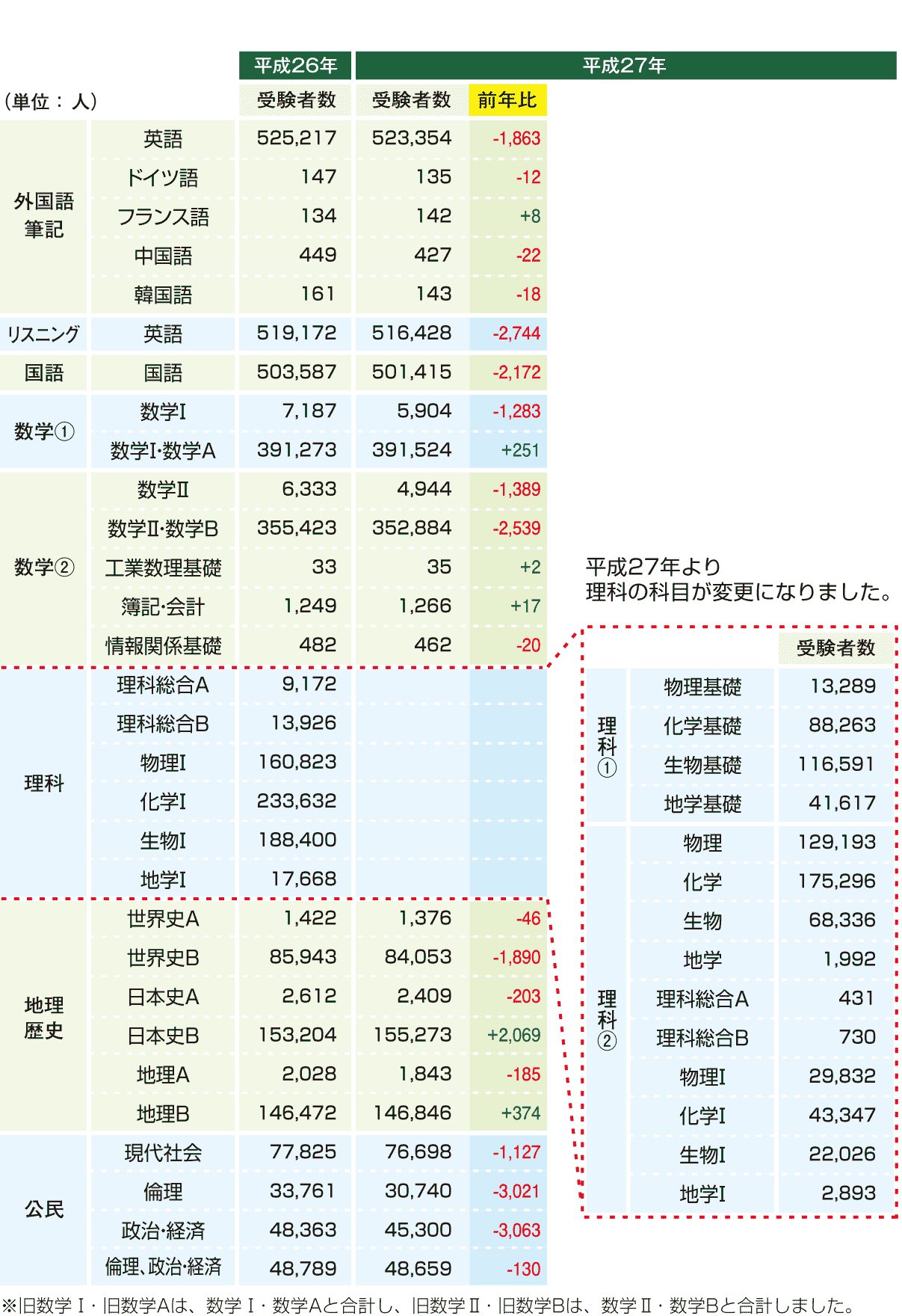 | データ資料: | 「平成27年度大学入試センター試験実施結果の概要」より <独立行政法人大学入試センター> |