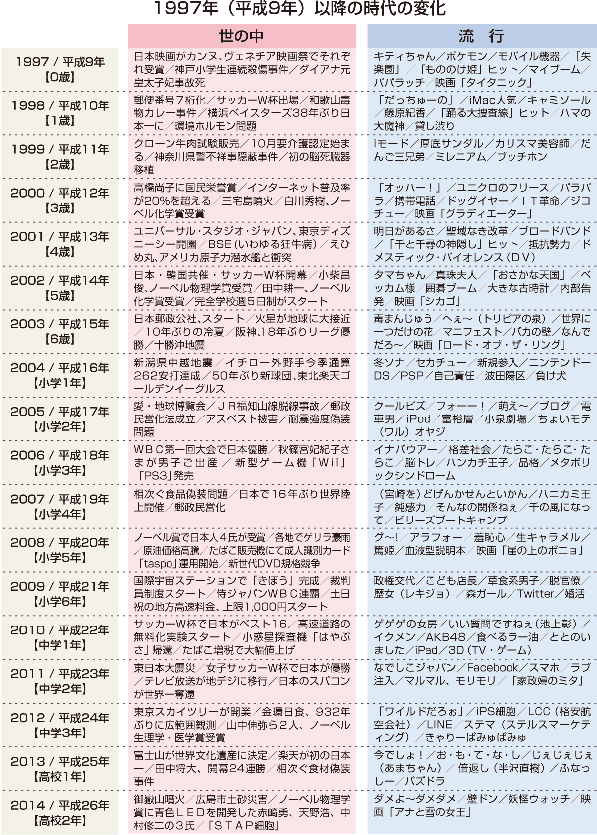 現在の高校3年生が生まれた年から、昨年までの「世の中」と「流行」をまとめました。彼らの人間像を理解するための一助としてご高覧いただければ幸いです。 |
