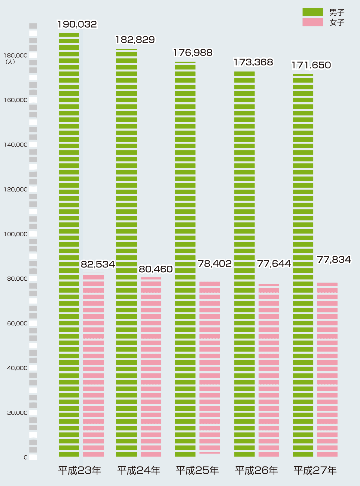 | データ資料: | 各年の学校基本調査報告書 平成27年は学校基本調査速報(平成27年8月発行)より<文部科学省> |