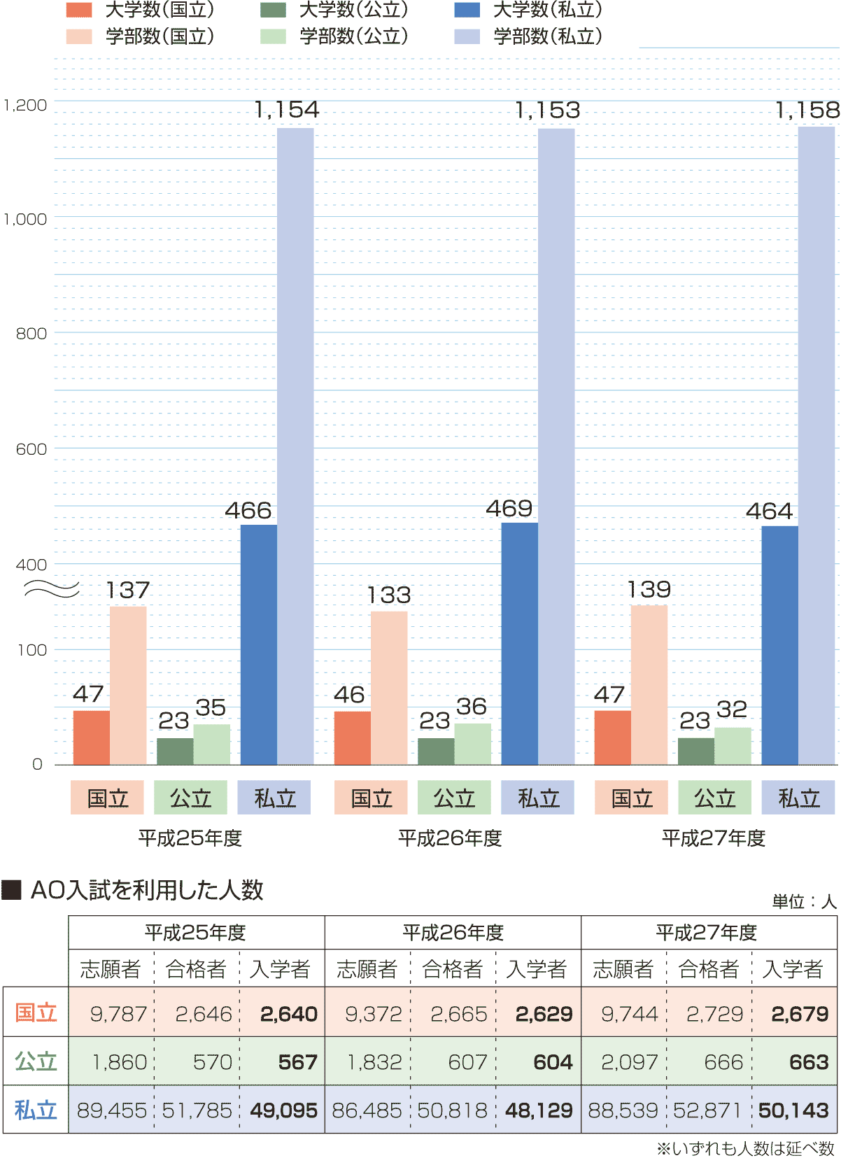| AO入試を実施した国公私立の大学・学部数(平成25~27年度) |