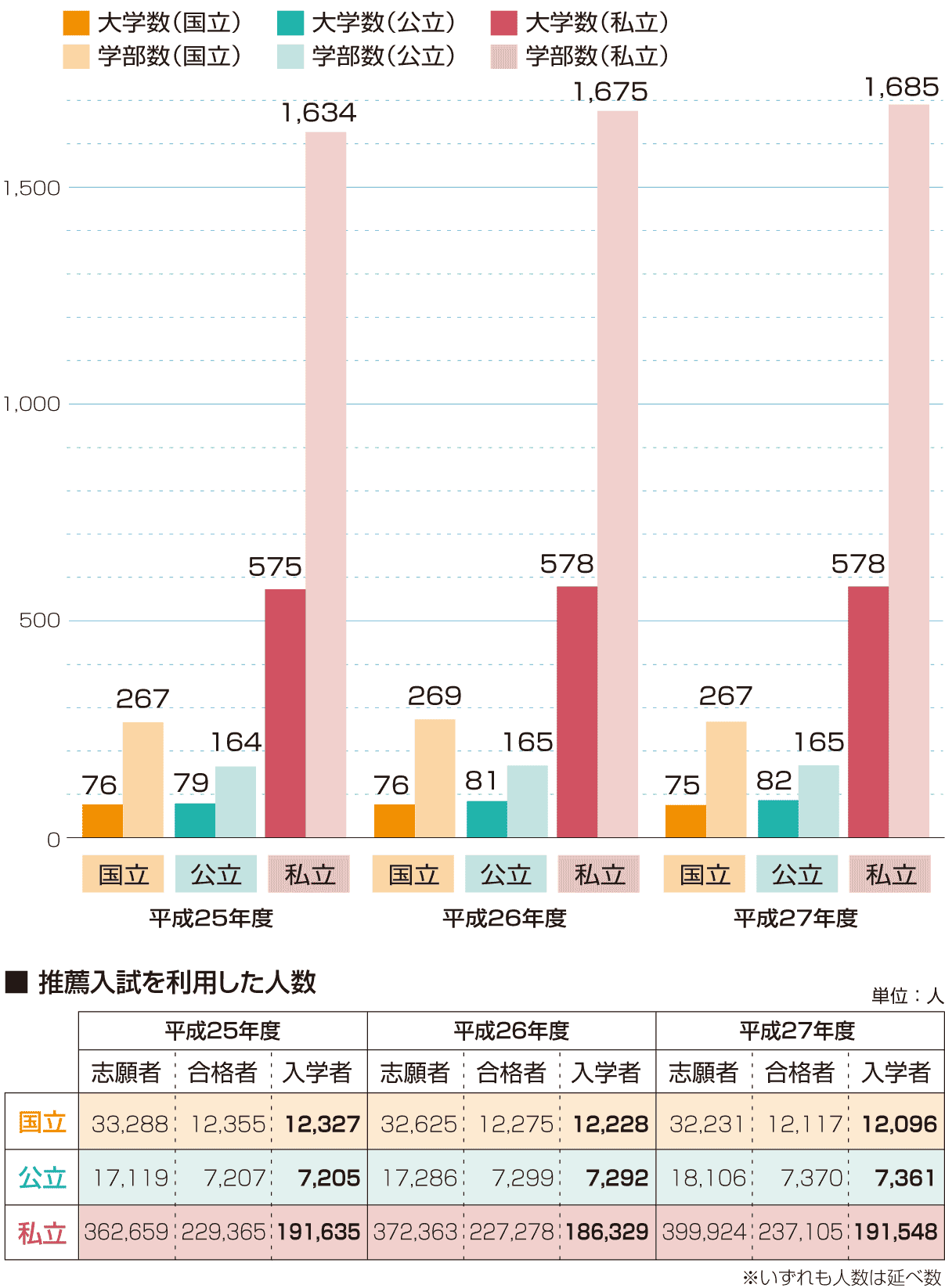 | 推薦入試を実施した国公私立の大学・学部数(平成25~27年度) |