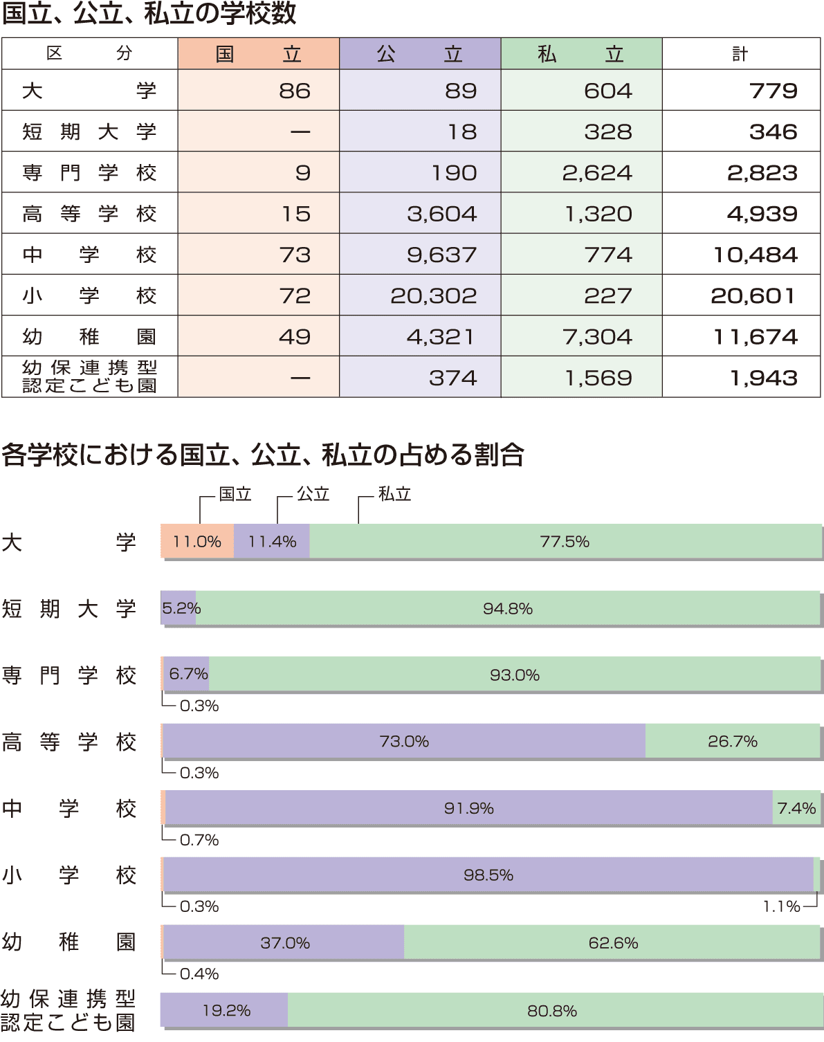 | 私立の学校の占める割合は、幼稚園で62.6%、小学校で1.1%、中学校で7.4%、高等 学校で26.7%となっています。 |