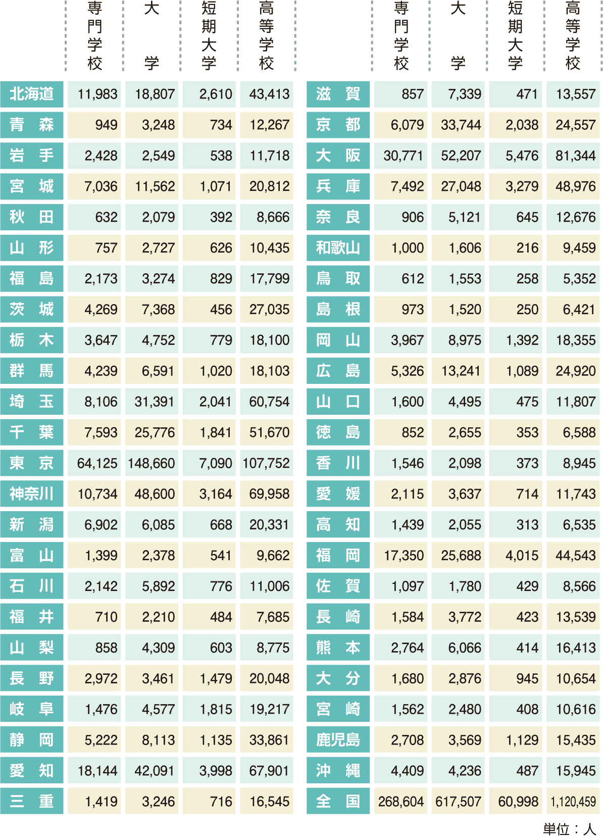 | 都道府県別/専門学校・大学・短期大学・高等学校 |