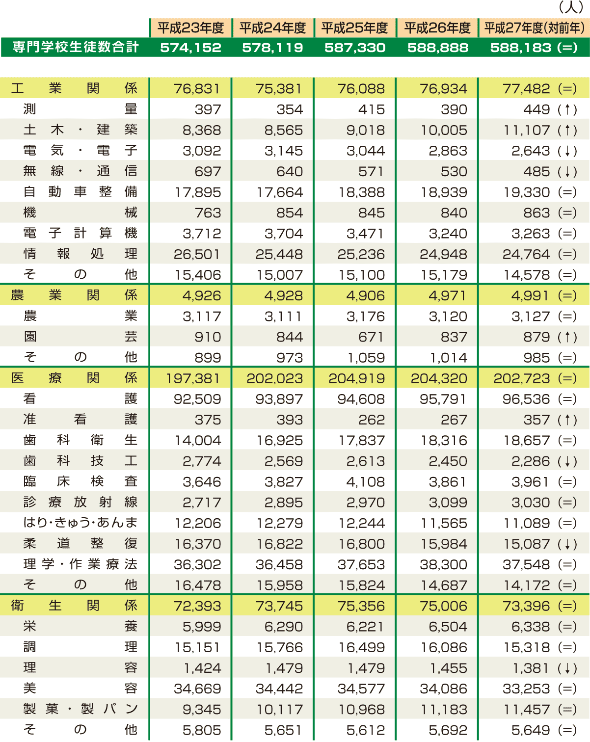 ★ 工業関係~衛生関係を掲載:教育・社会福祉関係、商業実務関係、服飾・家政関係、文化・教養関係は 次号に掲載します。 ※(対前年)について 生徒数の伸び率が+5%以上は(↑)、±5%未満は(=)、-5%以下は(↓) |