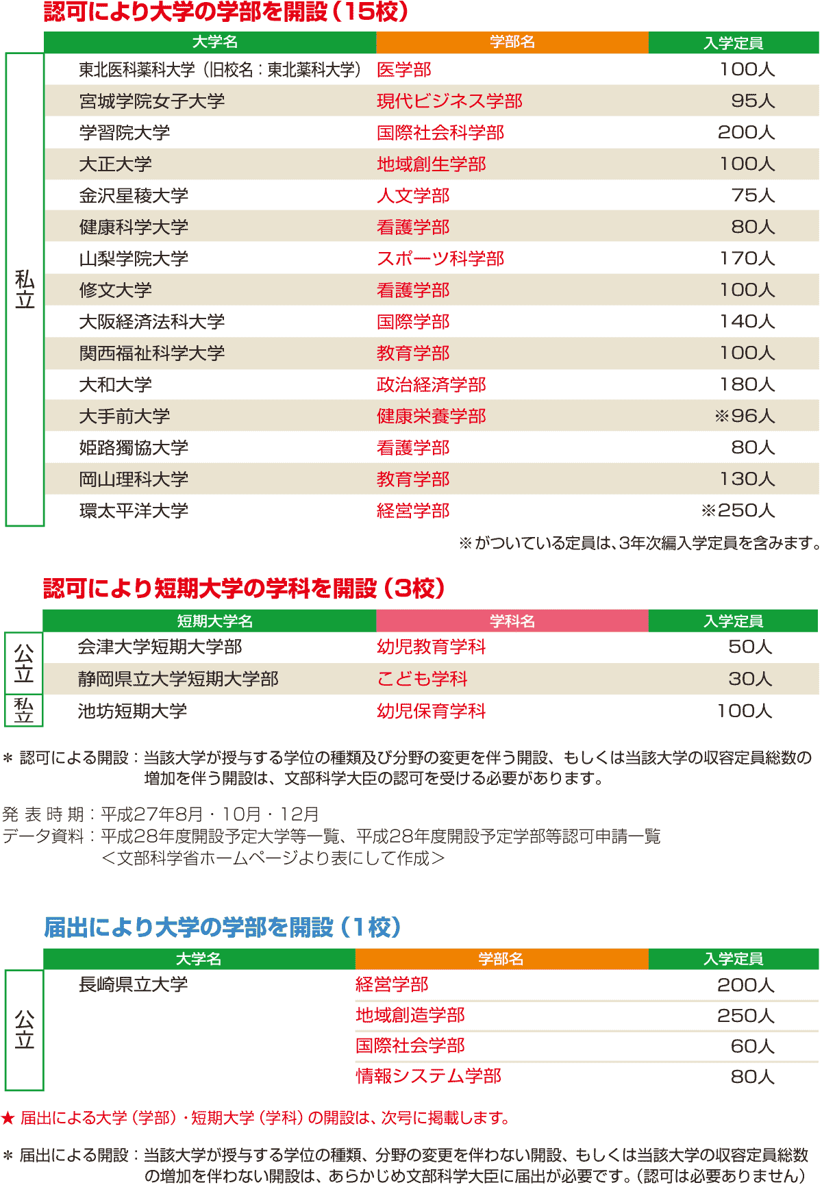 | データ資料: | 平成28年度開設予定の大学の学部等の設置届出一覧<文部科学省ホームページより表にして作成> |