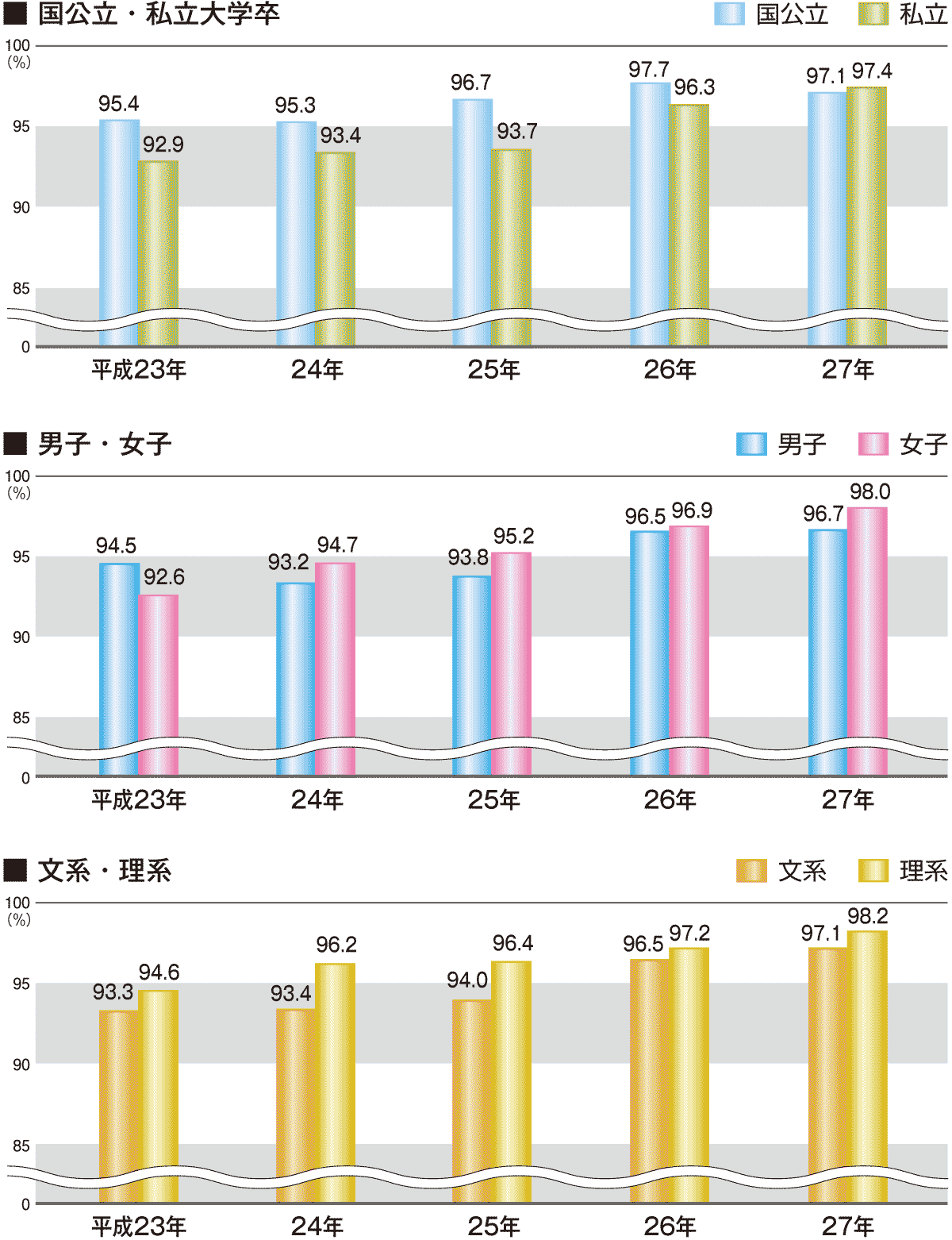 | 5年間の就職率*の推移(平成23年~27年) | *就職率は、就職希望者のうち、就職した人の割合です。 |