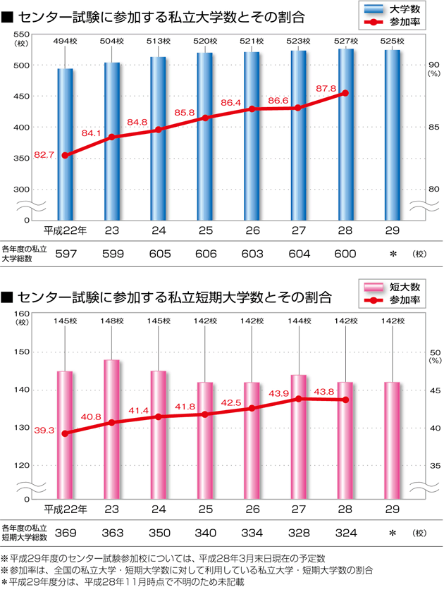 | データ資料: | 「独立行政法人 大学入試センター要覧」より 私立大学・短期大学総数については、各年の学校基本調査報告書より<文部科学省ホームページ> ※平成28年度の情報は、平成28年度学校基本調査速報(平成28年8月発行)よりグラフにして作成。 |