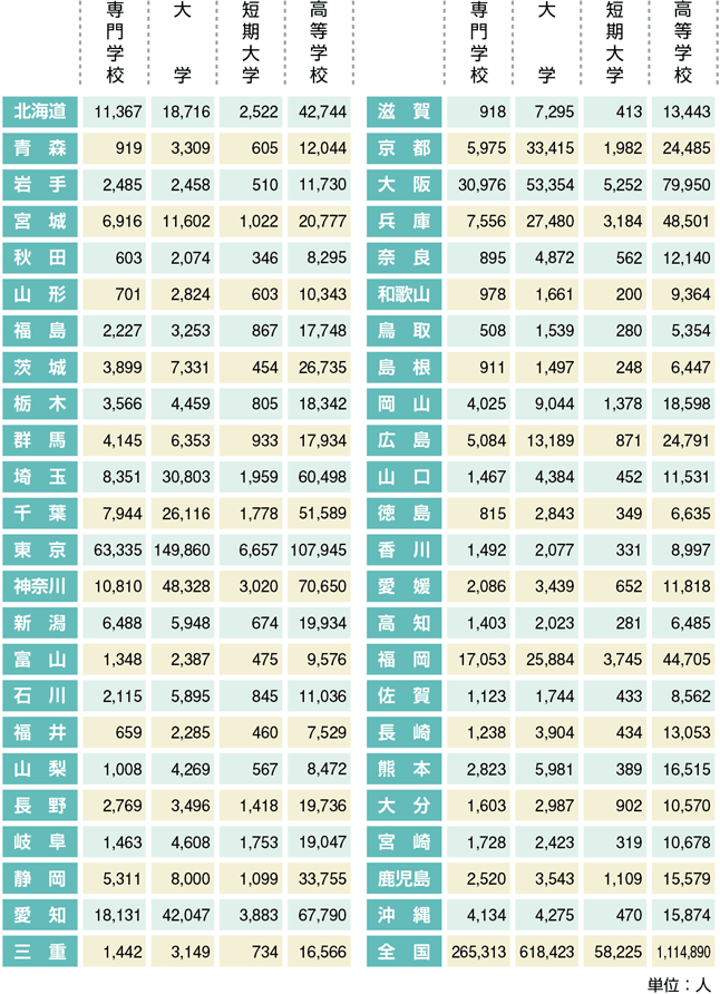 | 都道府県別/専門学校・大学・短期大学・高等学校 |