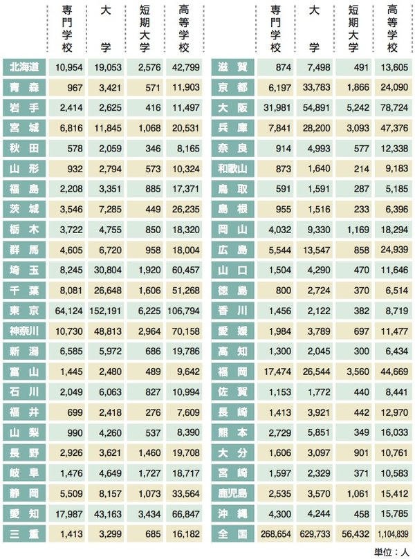 | 都道府県別/専門学校・大学・短期大学・高等学校 |