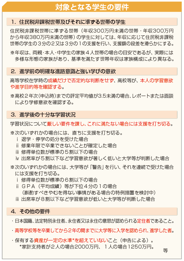 | データ資料: | 「高等教育無償化の制度の具体化に向けた方針の概要」(2018年12月) 「高等教育段階の教育費負担新制度に係る質問と回答(Q&A)」(2019年5月) (文部科学省)より小社にて抜粋して作成 ※最新情報は文部科学省HPでご確認ください。 |