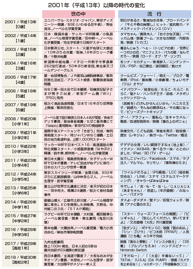 | 現在の高校3年生が生まれた年から、昨年までの「世の中」と「流行」をまとめま した。彼らの人間像を理解するための一助としてご高覧いただければ幸いです。 |