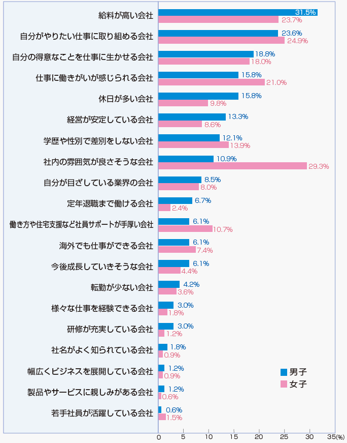| 将来、どのような会社で働きたいかについて、選択肢から重視するものを 2つまで選択してもらいました。 |