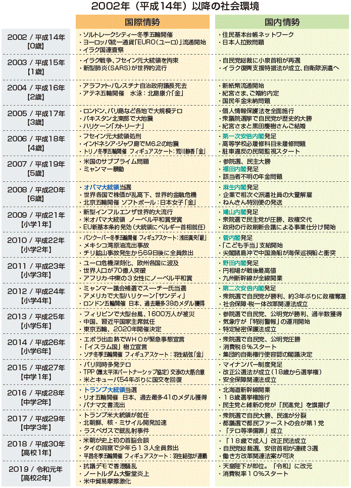 | 高校3年生が経てきた社会(1) | 現在の高校3年生が育った時代背景を理解するための一助として、ご高覧いただければ幸いです。 |