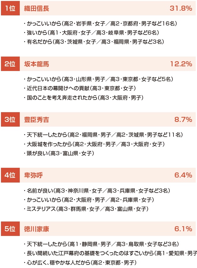 | 高校生が好きな「歴史上の人物」の名前とその理由を2名まで |