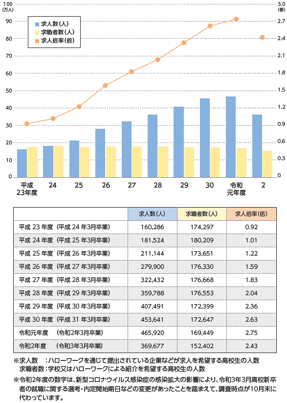 | データ資料: | 令和2年度「高校・中学新卒者のハローワーク求人に係る求人 ・求職・就職内定状況」(令和2年10月末現在) 厚生労働省のホームページよりグラフ・表にして作成 |