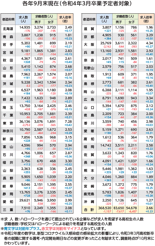 | データ資料 | : | 「令和4年3月高校・中学新卒者のハローワーク求人における求人・求職・就職内定状況」(9月末現在) 厚生労働省のホームページよりグラフ・表にして作成 |