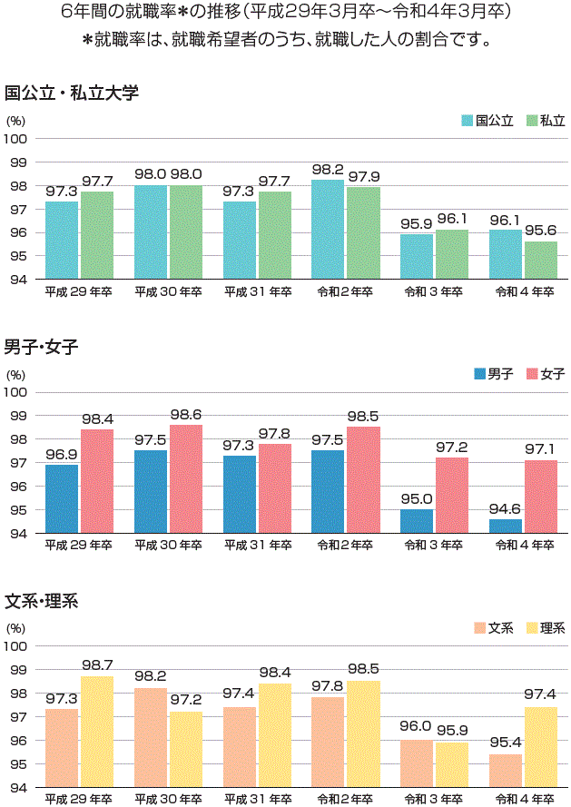 | データ資料 | : | 「平成28年度~令和3年度大学等卒業者の就職状況調査」 (文部科学省ホームページ)よりグラフにして作成 |
