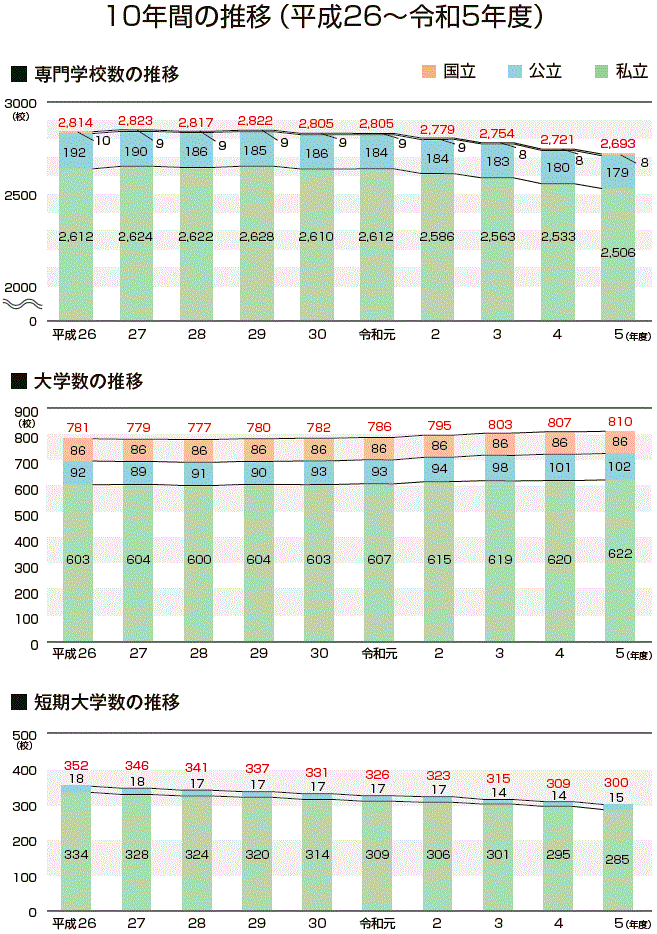 | データ資料 | : | 平成26~令和5年度の学校基本調査(文部科学省ホームページ)よりグラフにして作成。令和5年度は速報値。 |