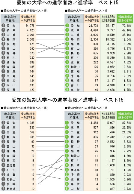 | 愛知への進学者数と「大学・短大進学者のうち何%が愛知に進学したか」という進学率の2つの視点から都道府県別にまとめました。 |