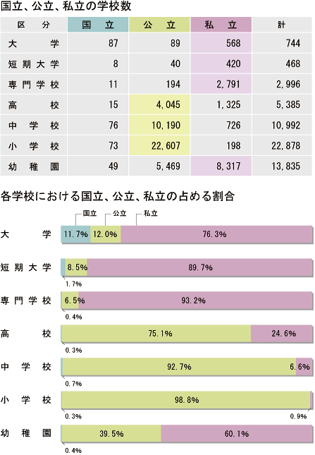 私立の学校の占める割合は、幼稚園で60.1%、小学校で0.9%、中学校で6.6%、高校で24.6%となっています。 |