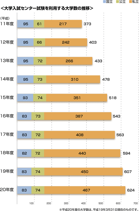 | 発表時期:平成19年4月27日 データ資料:平成20年度大学入学者選抜から大学入試センター試験を新たに利用する大学について 発 行:文部科学省 |