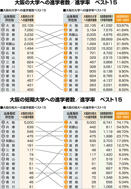 大阪への進学者数と「大学・短大進学者のうち何%が大阪に進学したか」という進学率の 2つの視点から都道府県別にまとめました。