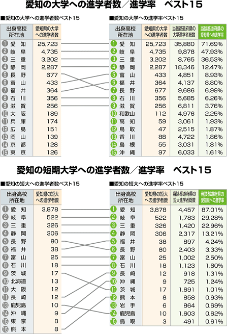 | 愛知への進学者数と「大学・短大進学者のうち何%が愛知に進学したか」という進学率の 2つの視点から都道府県別にまとめました。 |