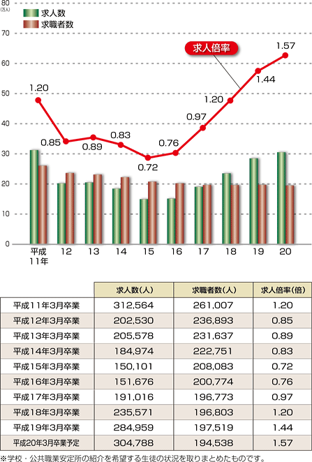 | 発表時期:平成19年11月 データ資料:平成19年度高校・中学新卒者の就職内定状況等(平成19年9月末現在)について <厚生労働省> |