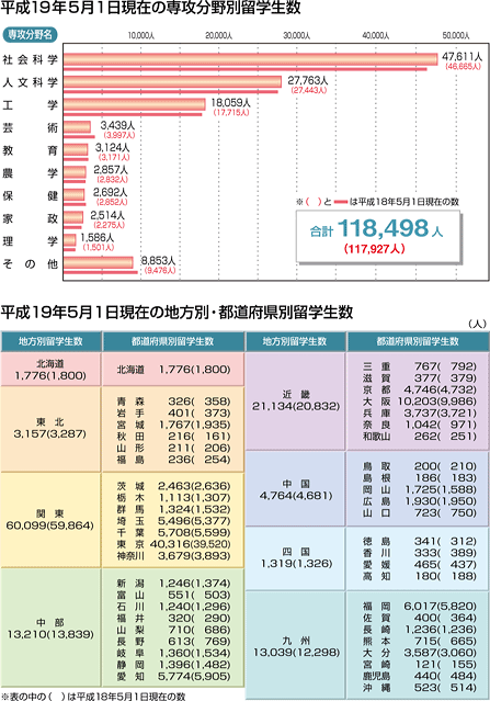 | 調査対象:留学ビザにより日本の高等教育機関へ入学、または入学するための準備教育を受ける 外国人学生 調査時期:各年5月1日現在 発表時期:平成19年12月 データ資料:「平成19年度外国人留学生在籍状況調査結果」独立行政法人日本学生支援機構 |