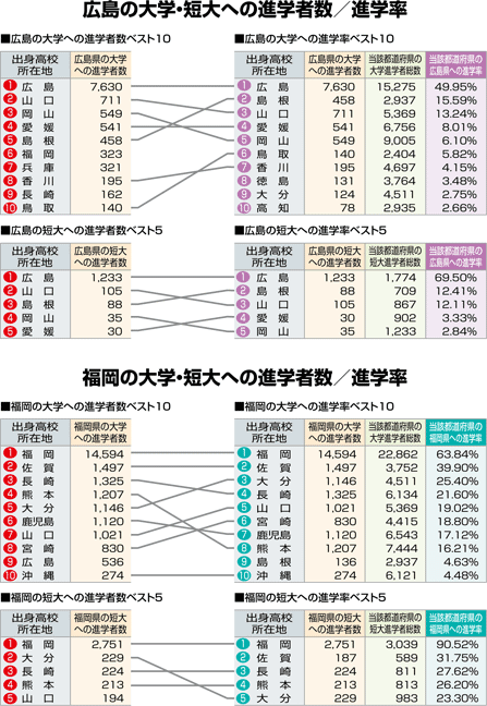 | 広島、福岡への進学者数と「大学・短大進学者のうち何%が広島、福岡に進学したか」とい う進学率の2つの視点から都道府県別にまとめました。 |