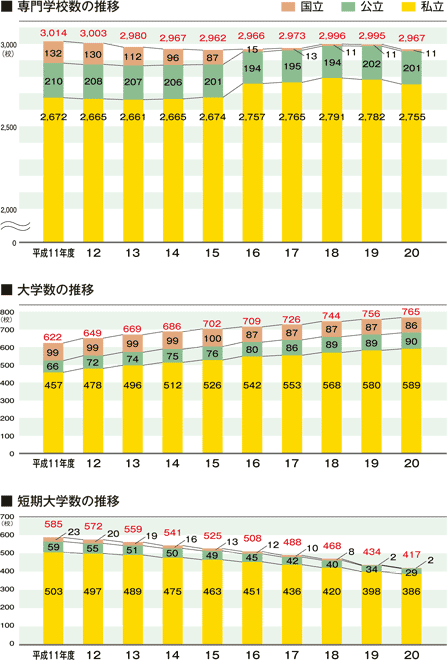 | 調査時期:各年5月1日現在 データ資料:各年の学校基本調査報告書<文部科学省> ※平成20年度は、平成20年度学校基本調査速報(平成20年8月発行)より |