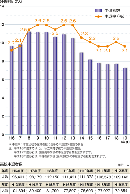 | 平成19年度 高等学校における中途退学者数は合計72,854人 |