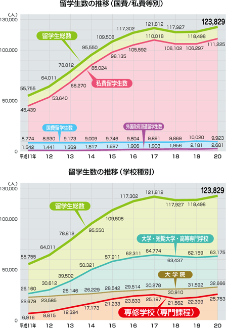 | 調査対象:留学ビザにより日本の高等教育機関へ入学、または入学するための準備教育を 受ける外国人学生 調査時期:各年5月1日現在 発表時期:平成20年12月 データ資料:「平成20年度外国人留学生在籍状況調査結果」独立行政法人日本学生支援機構 |