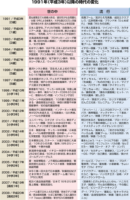 現在の高校3年生が生まれた年から、昨年までの「世の中」と「流行」をまとめました。彼らの人間像を理解するための一助としてご高覧いただければ幸いです。 |