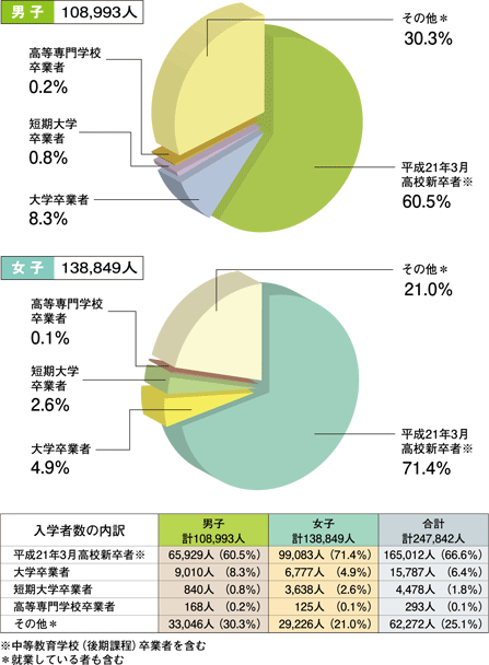平成21年4月専門学校入学者のうち、同年3月に高校を卒業した学生(新卒入学者)の占める割合は、男子60.5%、女子71.4%です。 |