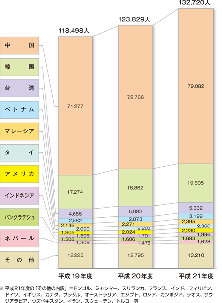 | データ資料: | 「平成21年度外国人留学生在籍状況調査結果」独立行政法人日本学生支援機構 |
